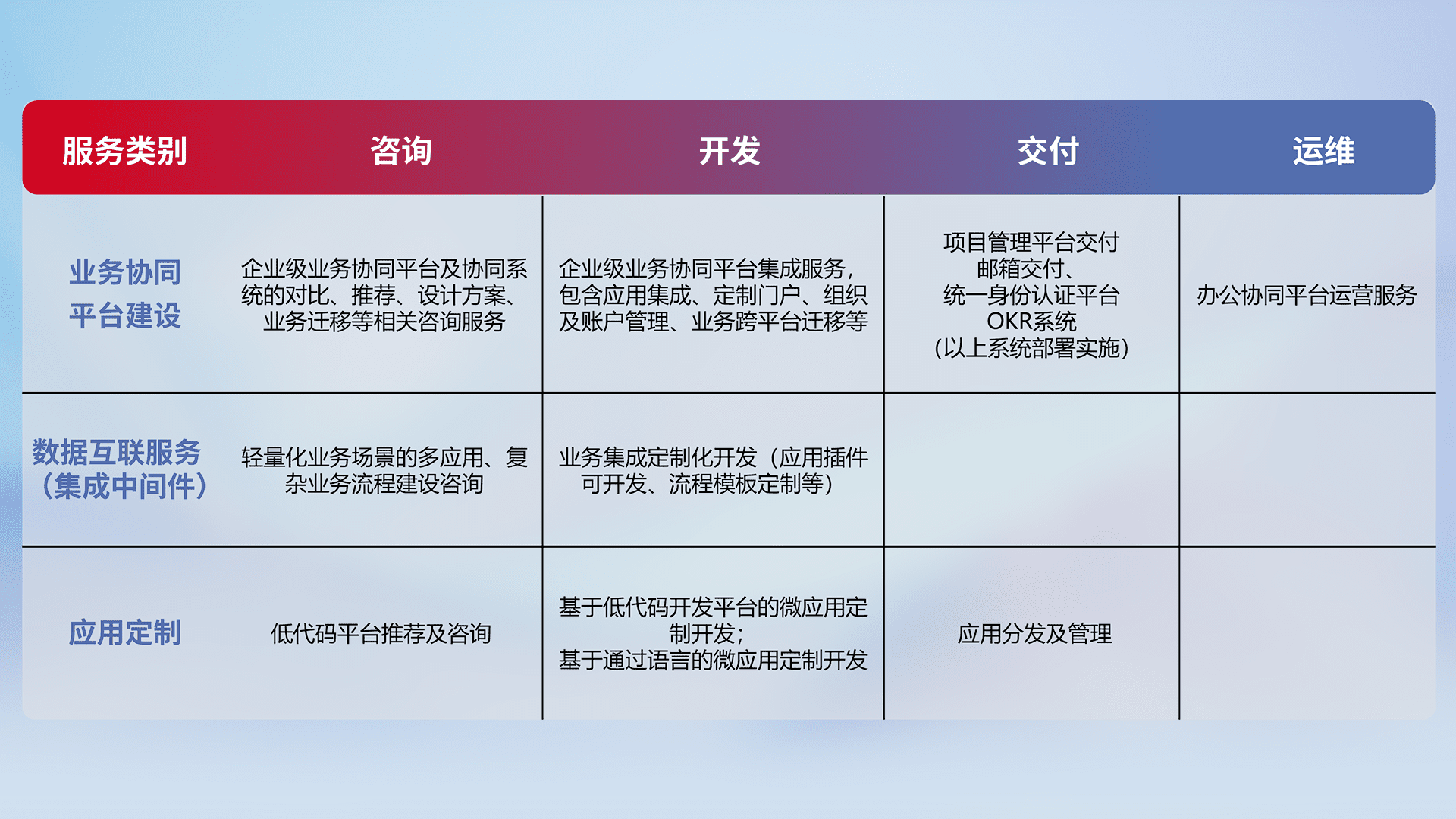 针对钉钉、、、企微、、IDaas等平台级产品提供产品的规划、、方案、、、、交付、、、定制化开发等服务,,,实现如统一协同办公、、、智能客户服务、、、混合会议管理、、智能数据查询、、等业务场景,,,,实现数字化转型。。。。